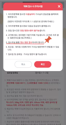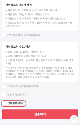 6. 택배를 이용할 수 없는 물품 꼭 확인하시고, 가장 아래 전체동의 선택하시고, 접수하기 눌러주세요.