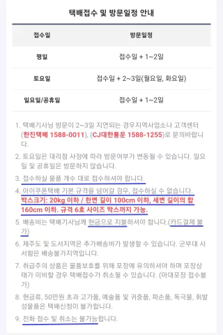 CJ대한통운은 대형택배 15kg 이하, 세변 길이의 합 140cm 이하로만 가져가시니,